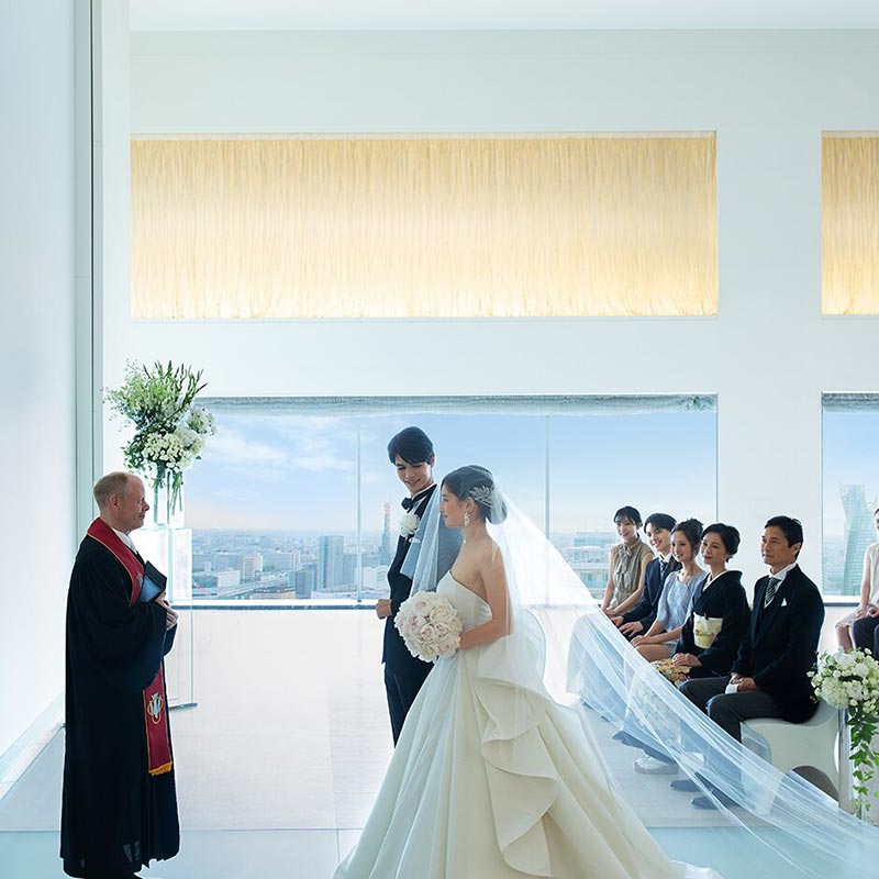 名古屋の街を105mから見渡すチャペルは写真以上に壮大で神聖。演出でカーテンが開く瞬間にゲストが「おおー!」と声を上げるのが目に浮かびます。