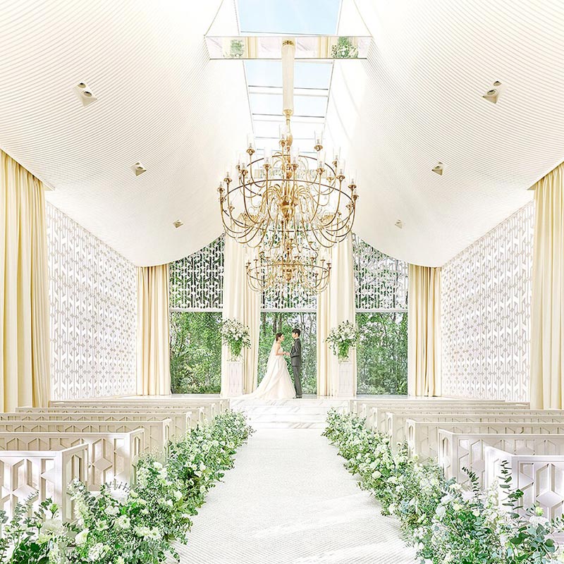 世界的インテリアデザイナー・橋本夕紀夫氏が手掛けたこの空間は、名古屋市街を一望するパノラマと17メートルのバージンロードが圧巻の挙式体験を生み出します。