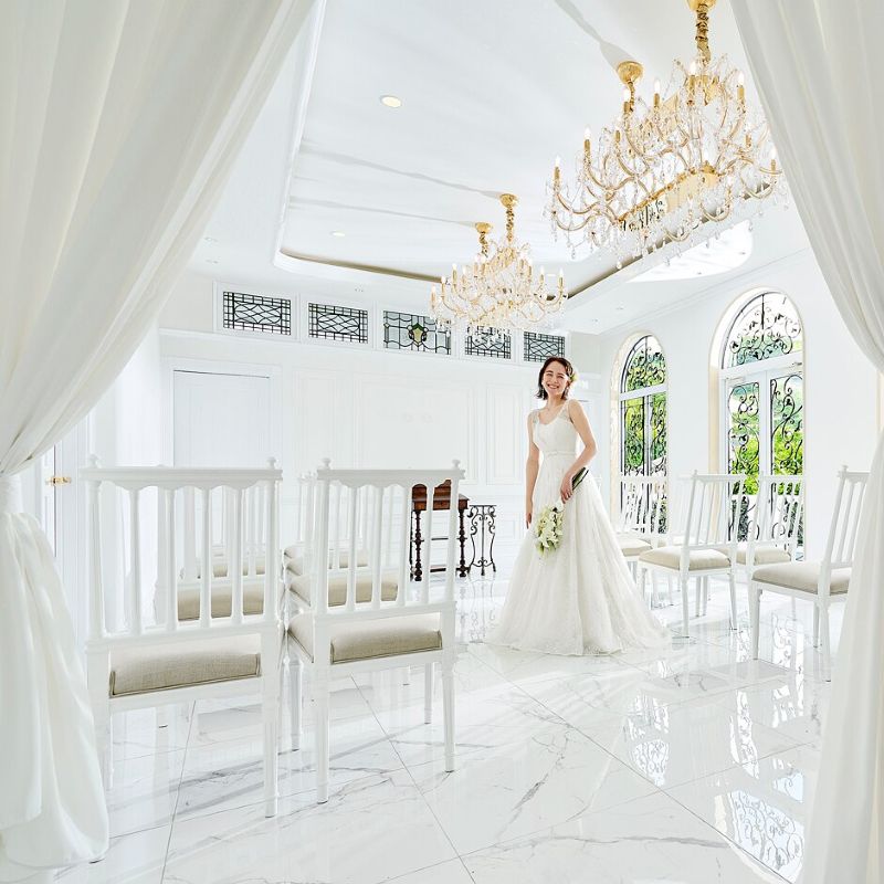 フランスのパッサージュを思わせる佇まいの建物に一歩足を踏み入れると、自然光がたっぷり差し込む白亜のチャペルが広がり、近い距離感のまま誓いの時間を迎えられるのが特長です。