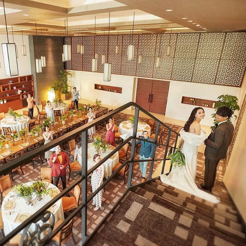 2層吹き抜けの大きな窓から自然光が差し込む披露宴会場では、大階段からの入場も可能。少人数でも印象的なシーンを演出できます。プライベートガーデンではグリルパーティやデザートビュッフェなど、形式に縛られない過ごし方も魅力。