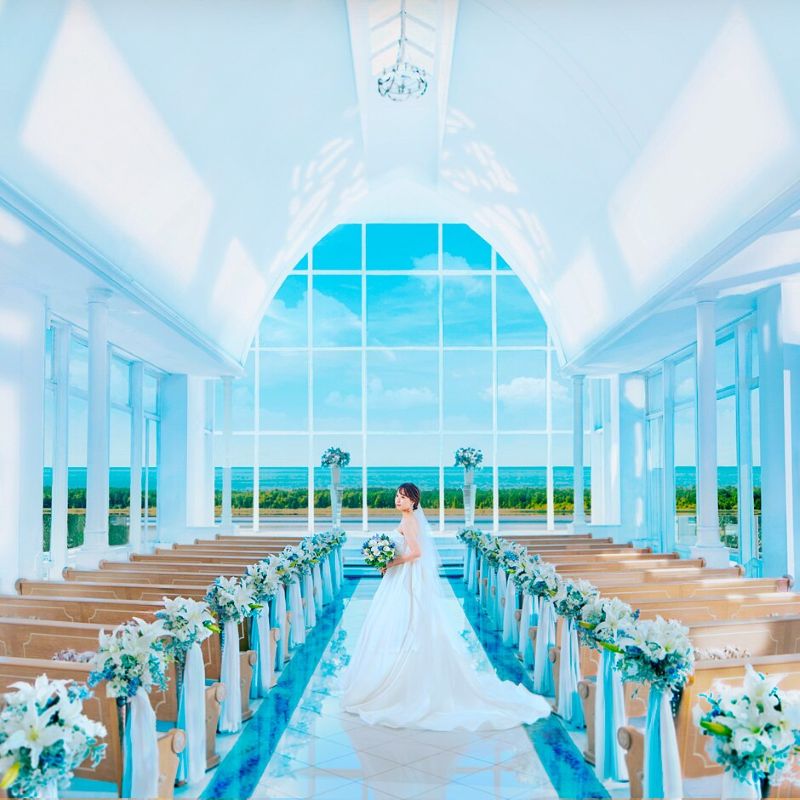 天空チャペルは大きな窓から海と空を望め、自然光に包まれた挙式が可能。