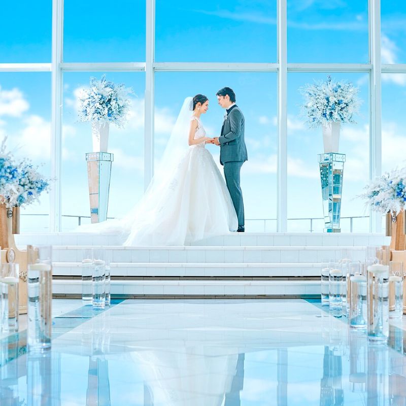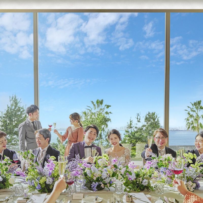 新浦安駅からバス約7分。海と空を望むガラス張りチャペルでの挙式は、20名規模でも開放感があり、非日常感のあるセレモニーが叶います。