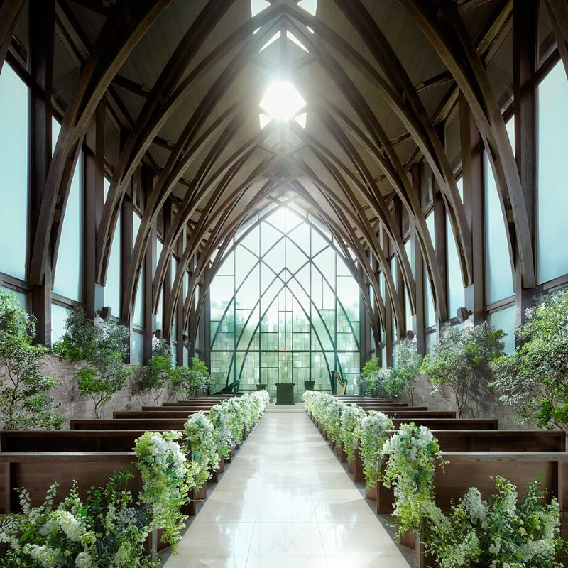 天井高・バージンロードともに13メートルとスケールがあり、少人数向けでありながら挙式の「きちんと感」を重視したいカップルにもおすすめです。ハープ・ピアノ・聖歌隊による生演奏に対応している点も、他会場との差別化ポイントですよ。