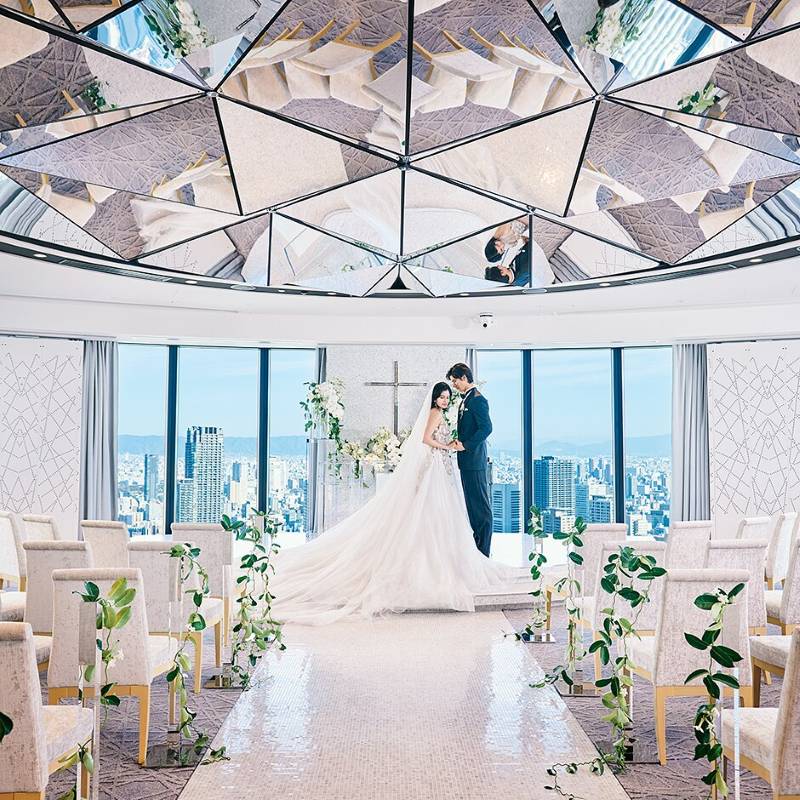 フロアから天井まで広がる窓の外には大阪の360度パノラマが広がり、ゲスト全員が息をのむ格別の挙式空間です。