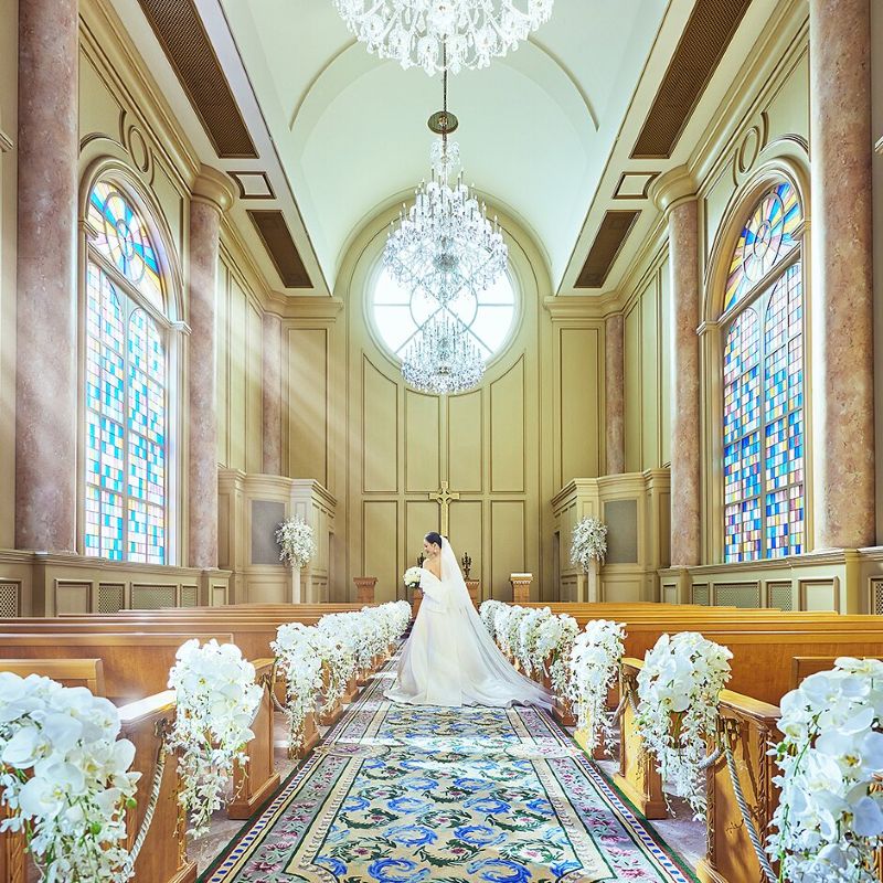ステンドグラスから差し込む光が幻想的で、「できるならここで挙式したい」と誰もが思うはず。